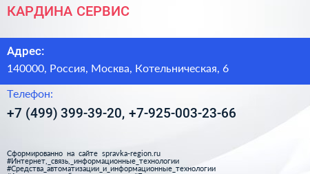 КАРДИНА-СЕРВИС по адресу 140000, Россия, Москва, Котельническая, 6 в дальнейшем Организация, размещена в следующих категориях: