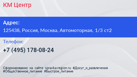 КМ Центр по адресу 125438, Россия, Москва, Автомоторная, 1/3 ст2 в дальнейшем Организация, размещена в следующих категориях: