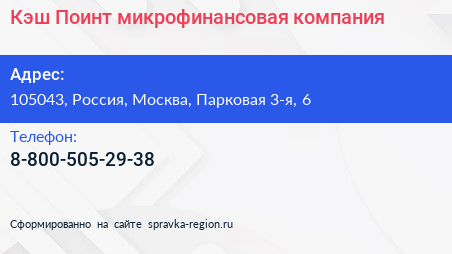 Кэш Поинт, микрофинансовая компания по адресу 105043, Россия, Москва, Парковая 3-я, 6 в дальнейшем Организация, размещена в следующих категориях: