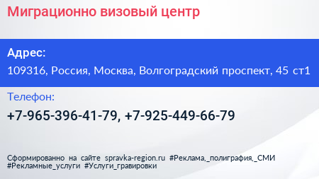 Миграционно-визовый центр по адресу 109316, Россия, Москва, Волгоградский проспект, 45 ст1 в дальнейшем Организация, размещена в следующих категориях: