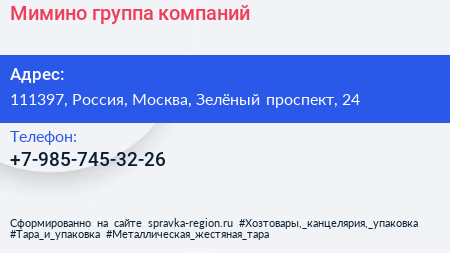 Мимино, группа компаний по адресу 111397, Россия, Москва, Зелёный проспект, 24 в дальнейшем Организация, размещена в следующих категориях: