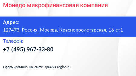 Монедо, микрофинансовая компания по адресу 127473, Россия, Москва, Краснопролетарская, 16 ст1 в дальнейшем Организация, размещена в следующих категориях: