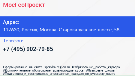 МосГеоПроект по адресу 117630, Россия, Москва, Старокалужское шоссе, 58 в дальнейшем Организация, размещена в следующих категориях: