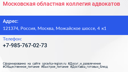Московская областная коллегия адвокатов по адресу 121374, Россия, Москва, Можайское шоссе, 4 к1 в дальнейшем Организация, размещена в следующих категориях:
