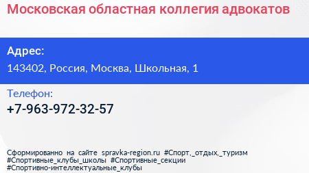 Московская областная коллегия адвокатов по адресу 143402, Россия, Москва, Школьная, 1 в дальнейшем Организация, размещена в следующих категориях: