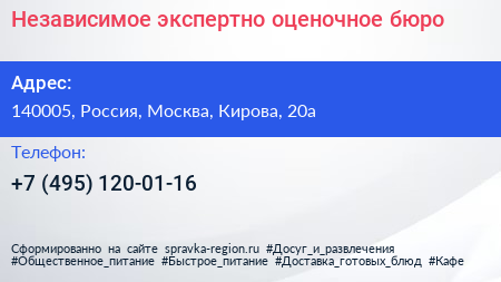 Независимое экспертно-оценочное бюро по адресу 140005, Россия, Москва, Кирова, 20а в дальнейшем Организация, размещена в следующих категориях: