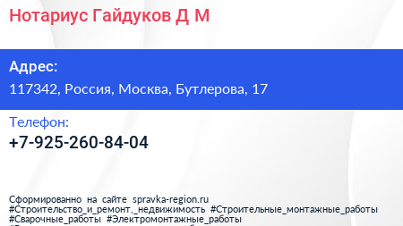 Нотариус Гайдуков Д.М. по адресу 117342, Россия, Москва, Бутлерова, 17 в дальнейшем Организация, размещена в следующих категориях: