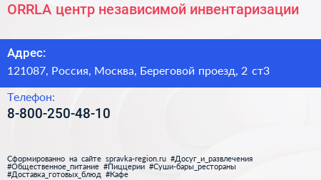ORRLA, центр независимой инвентаризации по адресу 121087, Россия, Москва, Береговой проезд, 2 ст3 в дальнейшем Организация, размещена в следующих категориях:
