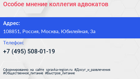 Особое мнение, коллегия адвокатов по адресу 108851, Россия, Москва, Юбилейная, 3а в дальнейшем Организация, размещена в следующих категориях: