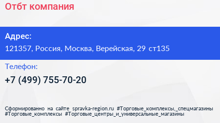 Отбт, компания по адресу 121357, Россия, Москва, Верейская, 29 ст135 в дальнейшем Организация, размещена в следующих категориях: