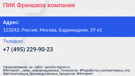 ПИК-Франшиза, компания по адресу 123242, Россия, Москва, Баррикадная, 19 к1 в дальнейшем Организация, размещена в следующих категориях:
