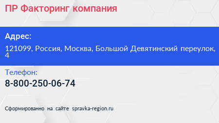 ПР-Факторинг, компания по адресу 121099, Россия, Москва, Большой Девятинский переулок, 4 в дальнейшем Организация, размещена в следующих категориях: