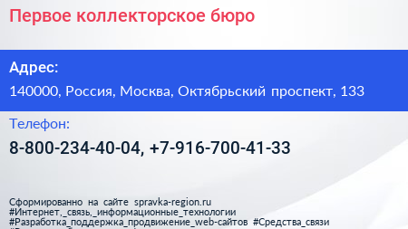 Первое коллекторское бюро по адресу 140000, Россия, Москва, Октябрьский проспект, 133 в дальнейшем Организация, размещена в следующих категориях: