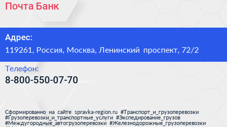 Почта Банк по адресу 119261, Россия, Москва, Ленинский проспект, 72/2 в дальнейшем Организация, размещена в следующих категориях: