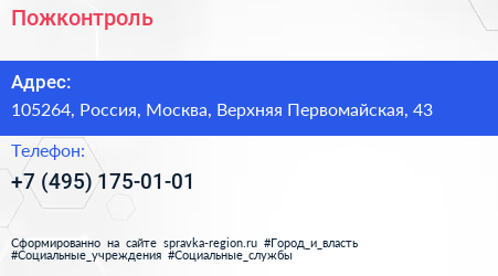 Пожконтроль по адресу 105264, Россия, Москва, Верхняя Первомайская, 43 в дальнейшем Организация, размещена в следующих категориях: