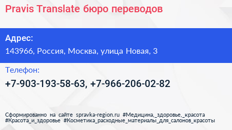 Pravis Translate, бюро переводов по адресу 143966, Россия, Москва, улица Новая, 3 в дальнейшем Организация, размещена в следующих категориях: