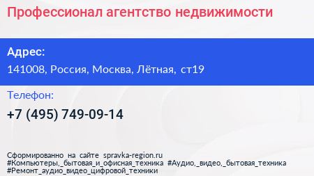 Профессионал, агентство недвижимости по адресу 141008, Россия, Москва, Лётная, ст19 в дальнейшем Организация, размещена в следующих категориях: