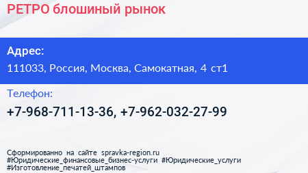 РЕТРО, блошиный рынок по адресу 111033, Россия, Москва, Самокатная, 4 ст1 в дальнейшем Организация, размещена в следующих категориях: