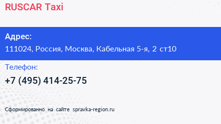 RUSCAR.Taxi по адресу 111024, Россия, Москва, Кабельная 5-я, 2 ст10 в дальнейшем Организация, размещена в следующих категориях: