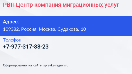 РВП Центр, компания миграционных услуг по адресу 109382, Россия, Москва, Судакова, 10 в дальнейшем Организация, размещена в следующих категориях: