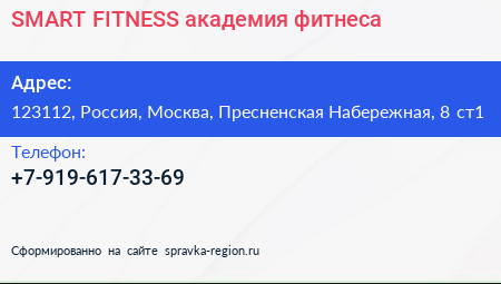 SMART FITNESS, академия фитнеса по адресу 123112, Россия, Москва, Пресненская Набережная, 8 ст1 в дальнейшем Организация, размещена в следующих категориях: