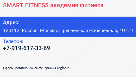 SMART FITNESS, академия фитнеса по адресу 123112, Россия, Москва, Пресненская Набережная, 10 ст1 в дальнейшем Организация, размещена в следующих категориях: