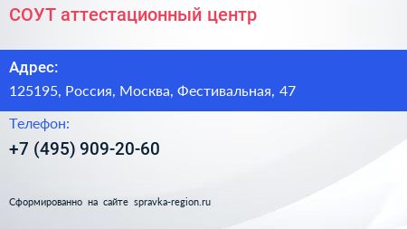 СОУТ, аттестационный центр по адресу 125195, Россия, Москва, Фестивальная, 47 в дальнейшем Организация, размещена в следующих категориях: