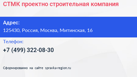 СТМК, проектно-строительная компания по адресу 125430, Россия, Москва, Митинская, 16 в дальнейшем Организация, размещена в следующих категориях: