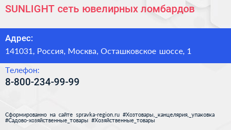 SUNLIGHT, сеть ювелирных ломбардов по адресу 141031, Россия, Москва, Осташковское шоссе, 1 в дальнейшем Организация, размещена в следующих категориях: