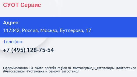 СУОТ-Сервис по адресу 117342, Россия, Москва, Бутлерова, 17 в дальнейшем Организация, размещена в следующих категориях: