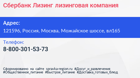 Сбербанк Лизинг, лизинговая компания по адресу 121596, Россия, Москва, Можайское шоссе, вл165 в дальнейшем Организация, размещена в следующих категориях: