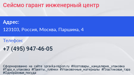 Сейсмо-гарант, инженерный центр по адресу 123103, Россия, Москва, Паршина, 4 в дальнейшем Организация, размещена в следующих категориях: