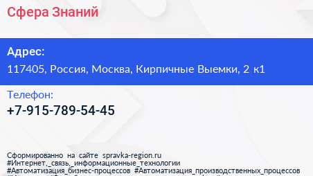 Сфера Знаний по адресу 117405, Россия, Москва, Кирпичные Выемки, 2 к1 в дальнейшем Организация, размещена в следующих категориях:
