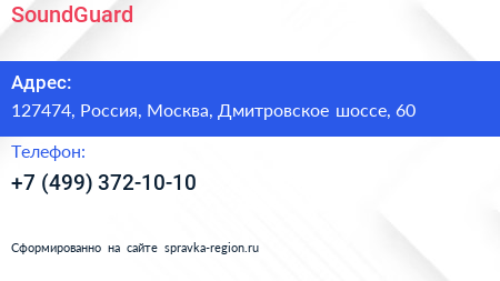 SoundGuard по адресу 127474, Россия, Москва, Дмитровское шоссе, 60 в дальнейшем Организация, размещена в следующих категориях: