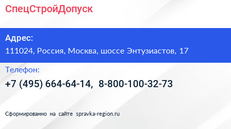 СпецСтройДопуск по адресу 111024, Россия, Москва, шоссе Энтузиастов, 17 в дальнейшем Организация, размещена в следующих категориях: