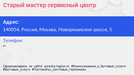 Старый мастер, сервисный центр по адресу 140054, Россия, Москва, Новорязанское шоссе, 5 в дальнейшем Организация, размещена в следующих категориях: