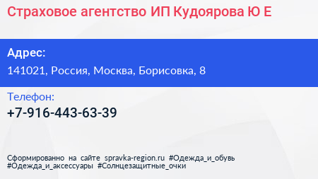 Страховое агентство, ИП Кудоярова Ю.Е. по адресу 141021, Россия, Москва, Борисовка, 8 в дальнейшем Организация, размещена в следующих категориях: