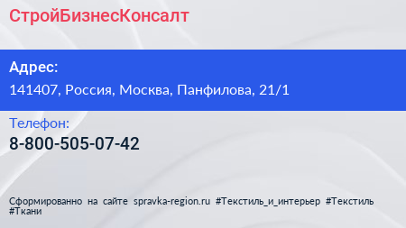 СтройБизнесКонсалт по адресу 141407, Россия, Москва, Панфилова, 21/1 в дальнейшем Организация, размещена в следующих категориях: