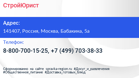 СтройЮрист по адресу 141407, Россия, Москва, Бабакина, 5а в дальнейшем Организация, размещена в следующих категориях: