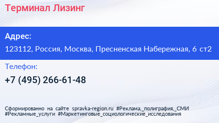 Терминал Лизинг по адресу 123112, Россия, Москва, Пресненская Набережная, 6 ст2 в дальнейшем Организация, размещена в следующих категориях: