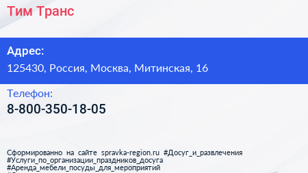 Тим Транс по адресу 125430, Россия, Москва, Митинская, 16 в дальнейшем Организация, размещена в следующих категориях: