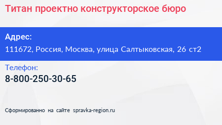 Титан, проектно-конструкторское бюро по адресу 111672, Россия, Москва, улица Салтыковская, 26 ст2 в дальнейшем Организация, размещена в следующих категориях: