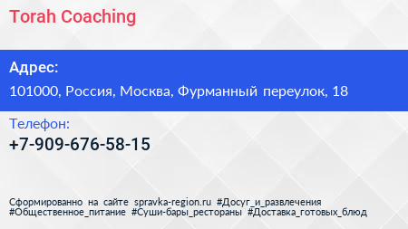 Torah Coaching по адресу 101000, Россия, Москва, Фурманный переулок, 18 в дальнейшем Организация, размещена в следующих категориях: