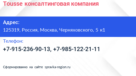 Tousse, консалтинговая компания по адресу 125319, Россия, Москва, Черняховского, 5 к1 в дальнейшем Организация, размещена в следующих категориях: