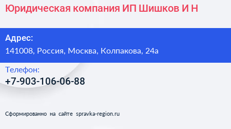 Юридическая компания, ИП Шишков И.Н. по адресу 141008, Россия, Москва, Колпакова, 24а в дальнейшем Организация, размещена в следующих категориях: