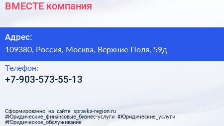 ВМЕСТЕ, компания по адресу 109380, Россия, Москва, Верхние Поля, 59д в дальнейшем Организация, размещена в следующих категориях: