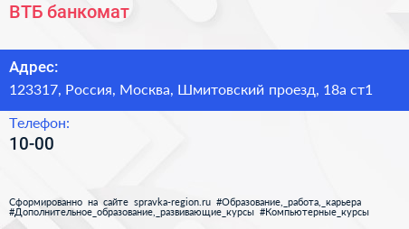 ВТБ, банкомат по адресу 123317, Россия, Москва, Шмитовский проезд, 18а ст1 в дальнейшем Организация, размещена в следующих категориях: