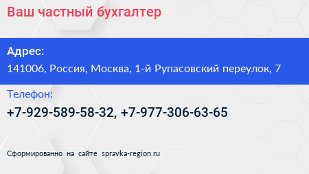 Ваш частный бухгалтер по адресу 141006, Россия, Москва, 1-й Рупасовский переулок, 7 в дальнейшем Организация, размещена в следующих категориях: