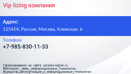 Vip-lizing, компания по адресу 125414, Россия, Москва, Клинская, 6 в дальнейшем Организация, размещена в следующих категориях: