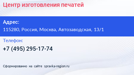 Центр изготовления печатей по адресу 115280, Россия, Москва, Автозаводская, 13/1 в дальнейшем Организация, размещена в следующих категориях: